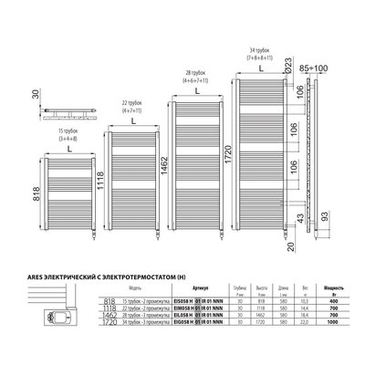 Полотенцесушитель электрический IRSAP Ares/Electric EH 818/580 15 трубок белый