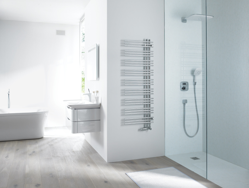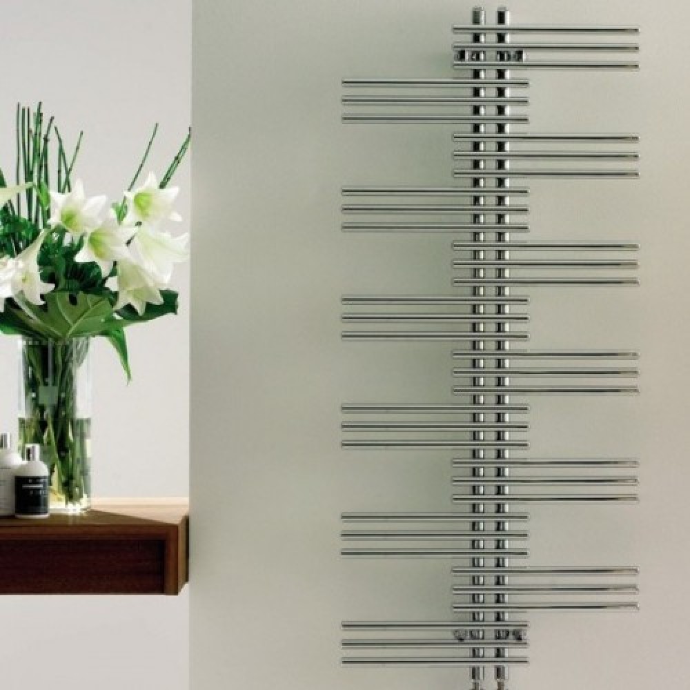 Электрические дизайнерские полотенцесушители Zehnder Yucca Asym представляют собой конструкцию, состоящую из горизонтально расположенных нагревательных труб, пересекающихся под прямым углом с вертикальными коллекторами. Трубы и коллектора стальные. Соединение выполнено методом лазерной сварки, что делает сварные швы практически незаметными. Сгруппированные по три горизонтальные нагревательные трубы располагаются асимметрично по отношению к вертикальным коллекторам. Смещенное в сторону крепление коллекторов позволяет удобно разместить на горизонтальных трубах полотенце для просушивания или согревания. Диаметр коллекторов составляет 30 мм, горизонтальных нагревательных труб – 20 мм.
