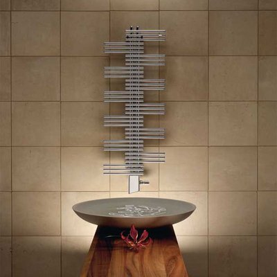 Электрические дизайнерские полотенцесушители Zehnder Yucca представляют собой конструкцию, состоящую из горизонтально расположенных нагревательных труб и вертикально расположенных коллек торов, выполненных из стали. Соединение выполнено методом лазерной сварки, что делает сварные швы практически незаметными. Сгруппированные по три горизонтальные нагревательные трубы располагаются поочередно с правой и с левой стороны от коллекторов. Такое смещенное в разные стороны крепление горизонтальных нагревательных труб позволяет удобно размещать на них полотенца, которые всегда будут сухими и теплыми. Диаметр коллекторов составляет 30 мм, горизонтальных нагревательных труб – 20 мм.